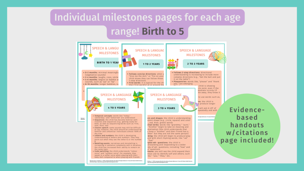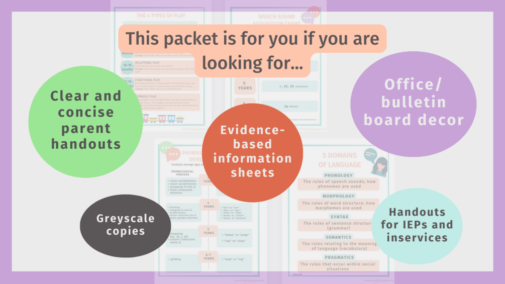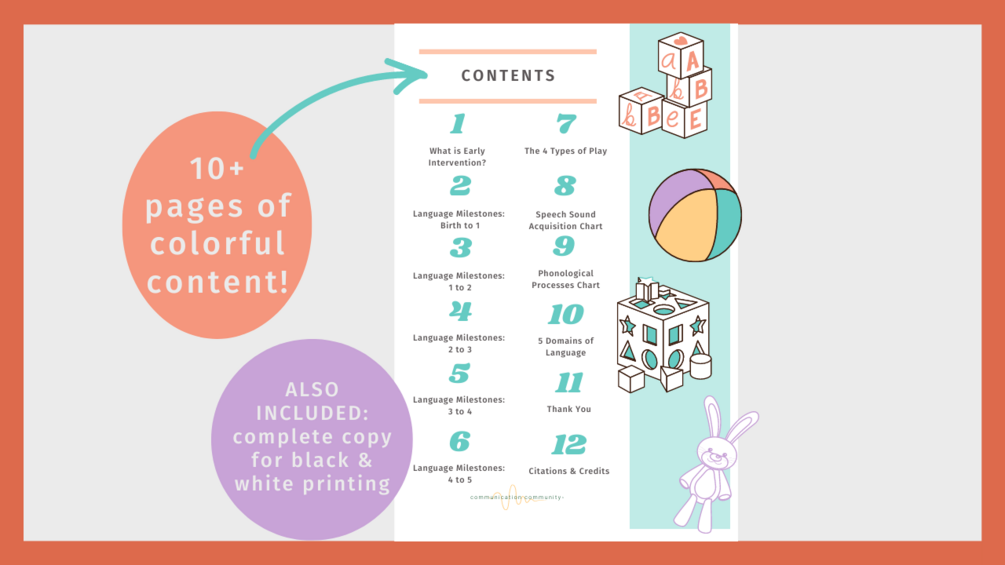 Packet includes: Contents page, Early Intervention (EI) facts page, detailed speech and language milestones: birth to 5, 4 types of play infographic, speech sound acquisition chart, phonological processes development chart, & 5 domains of language infographic
