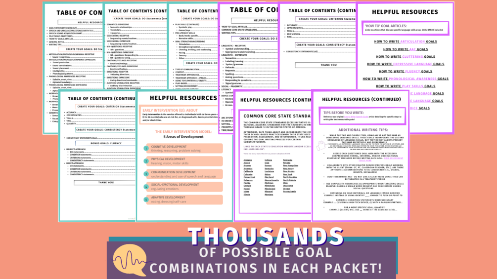 This easy-to-use speech therapy goal bank is great for new and experienced SLPs. It's perfect for writing IEP and/or IFSP goals. ThenBUNDLE features measurable EI and preschool/pre-K goal bank & AAC goal bank for child and adult use! Select your own combination of DO + CONDITION + CRITERION (and consistency) statements to develop personalized and measurable goals for your caseload.