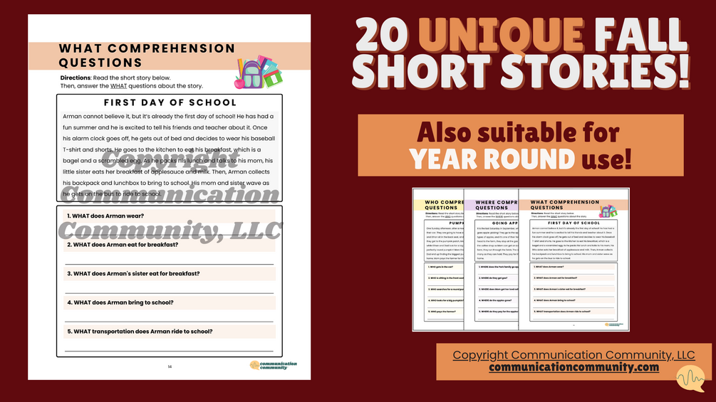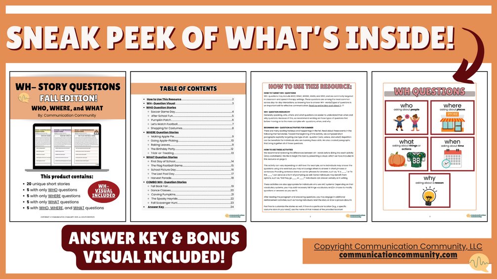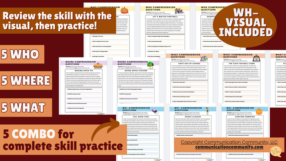 You'll get 20 unique fall-themed stories with 5 accompanying WH- questions. You'll also get a WH- question visual and answer key!