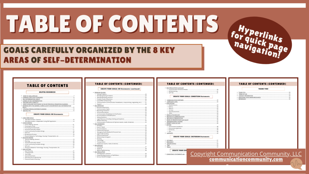 50+ pages of goal statements and resources! Goal statements cover the 8 KEY areas of self-determination and various person-centered areas: school, vocations/jobs, community skills, dining, technology, housing, transportation, self-care, finances, communication, relationships & support, and more!