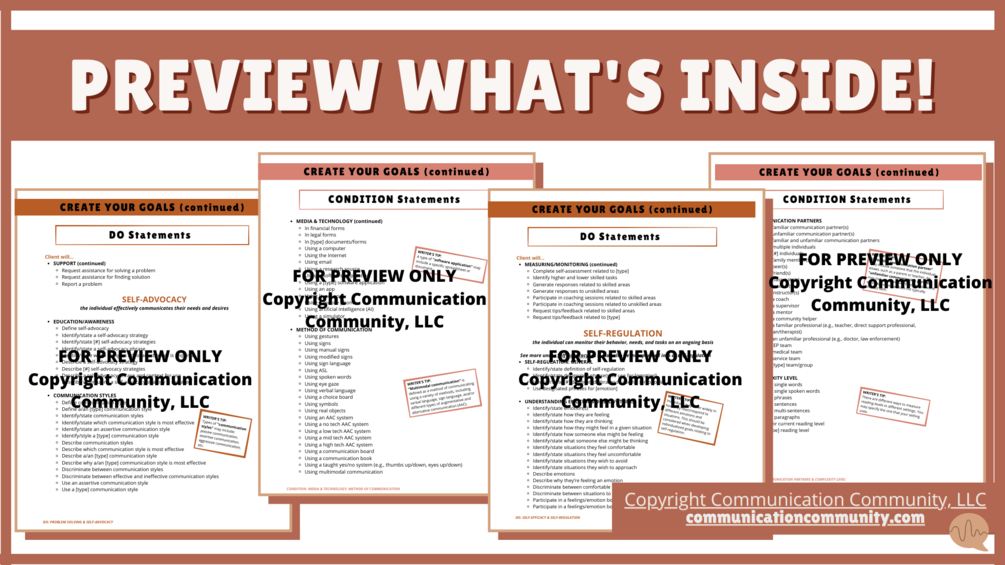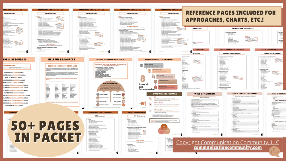50+ pages of goal statements and resources! Goal statements cover the 8 KEY areas of self-determination and various person-centered areas: school, vocations/jobs, community skills, dining, technology, housing, transportation, self-care, finances, communication, relationships & support, and more!
