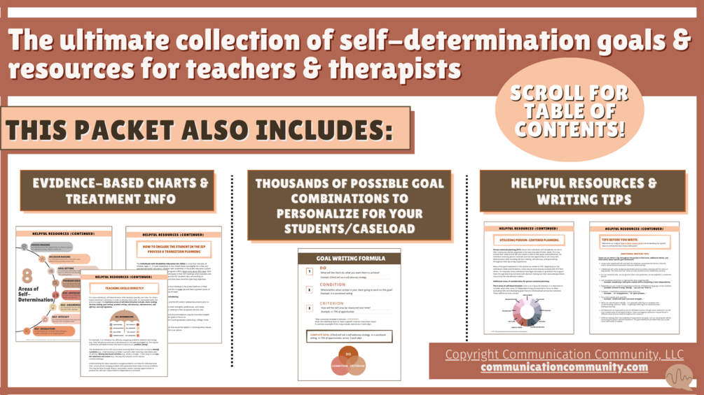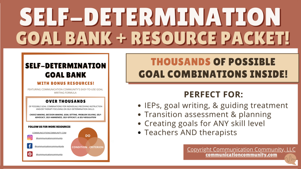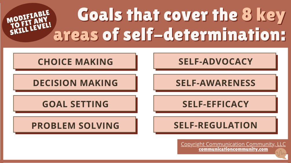 ⭐ Neurodiversity-affirming! This GOAL BANK is packed with bonus resources and can be applied to a WIDE RANGE of skill levels. This packet covers the 8 key areas of SELF-DETERMINATION: choice making, decision making, goal setting, problem solving, self-advocacy, self-awareness, self-efficacy, and self-regulation.