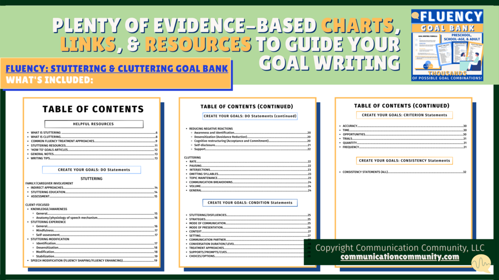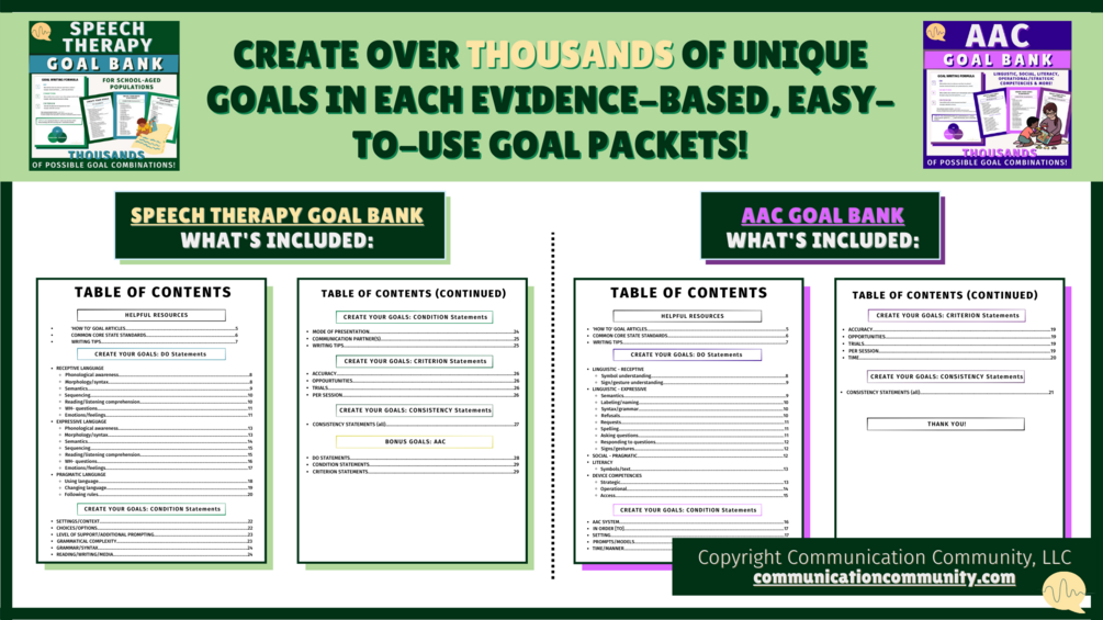 You'll get FOUR comprehensive goal banks with RESOURCES included! Language (Receptive, Expressive, & Pragmatic), AAC, Speech Sound Disorders, and Fluency.
