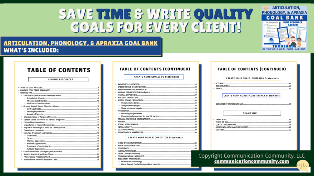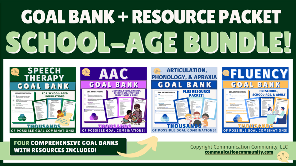 If you are a school-age therapist, this is the bundle for you! HUGE savings (time & $$$) when purchased together! Includes FOUR detailed goal banks with additional BONUS resources. Our favorites: phonological processes chart, IPA lists with examples, breakdown of the different fluency approaches, and much more!