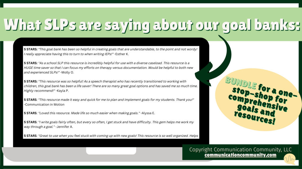 You'll get FOUR comprehensive goal banks with RESOURCES included! Language (Receptive, Expressive, & Pragmatic), AAC, Speech Sound Disorders, and Fluency.